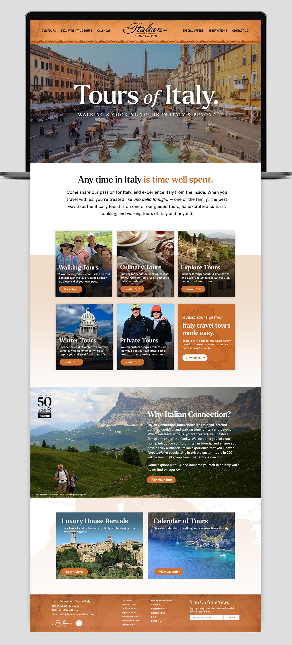 Italian Connection specializes in hand-crafted guided cultural, culinary, and walking tours in Italy and beyond. When it came time to revamp their website, I focused onĀ goals to showcase their variety of tours and drive traffic to book the perfect Italian tour.