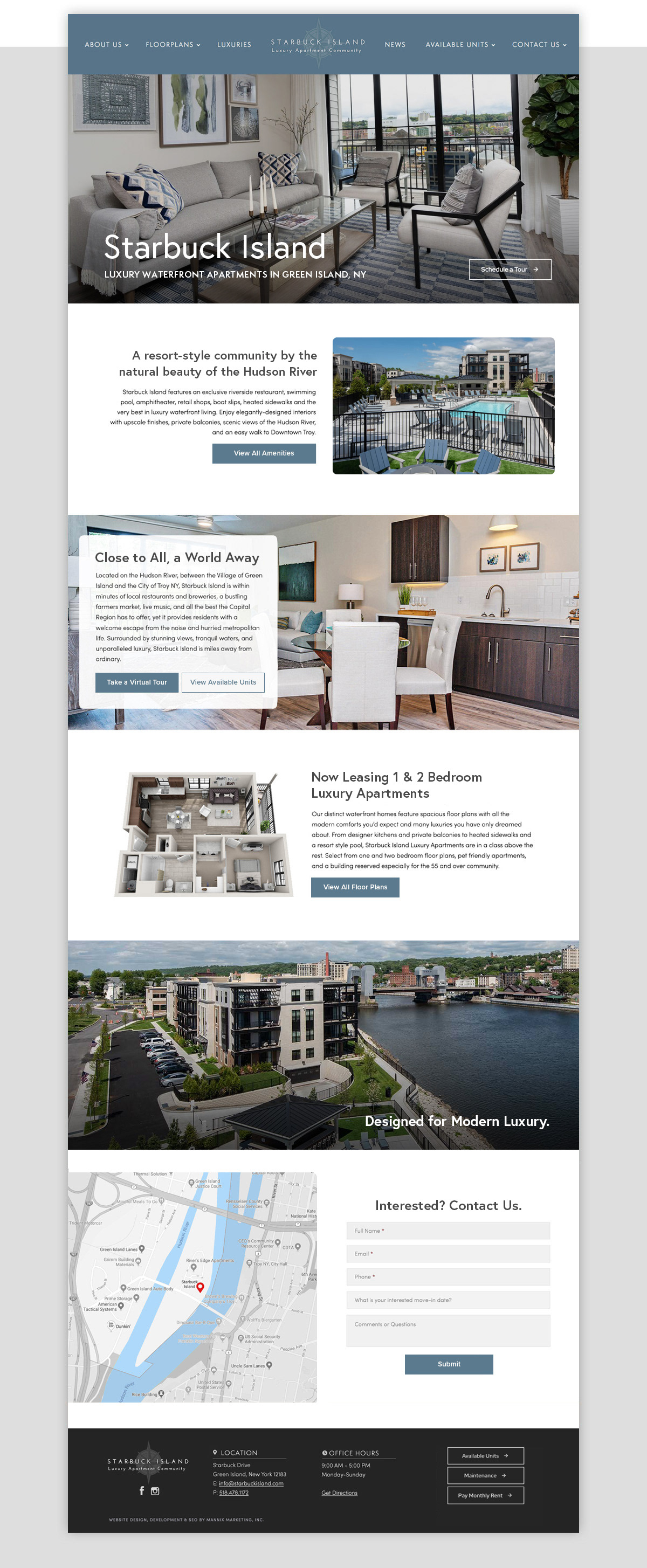 Troy's Newest Luxury Apartment Community, Starbuck Island offers residents resort-style amenities and scenic views of the Hudson River. Home to four luxury apartment buildings and nearly 270 apartments.